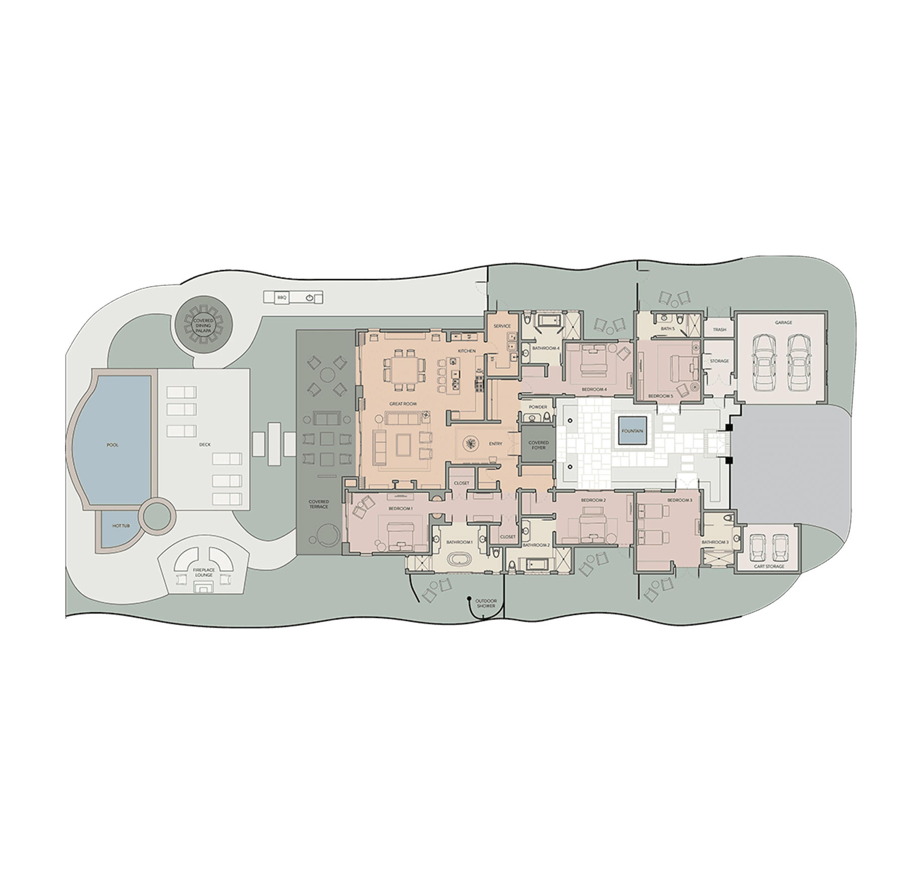 Expansive outdoor area including a sprawling lawn, infinity pool, hot tub, built-in BBQ, outdoor fireplace, and covered dining palapa